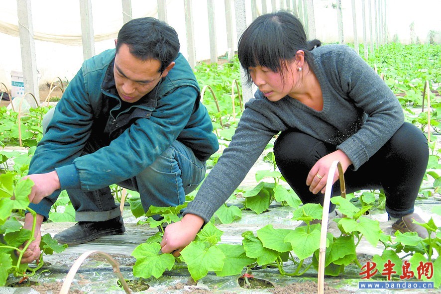王光春夫婦正在滴灌大棚里整理黃瓜。