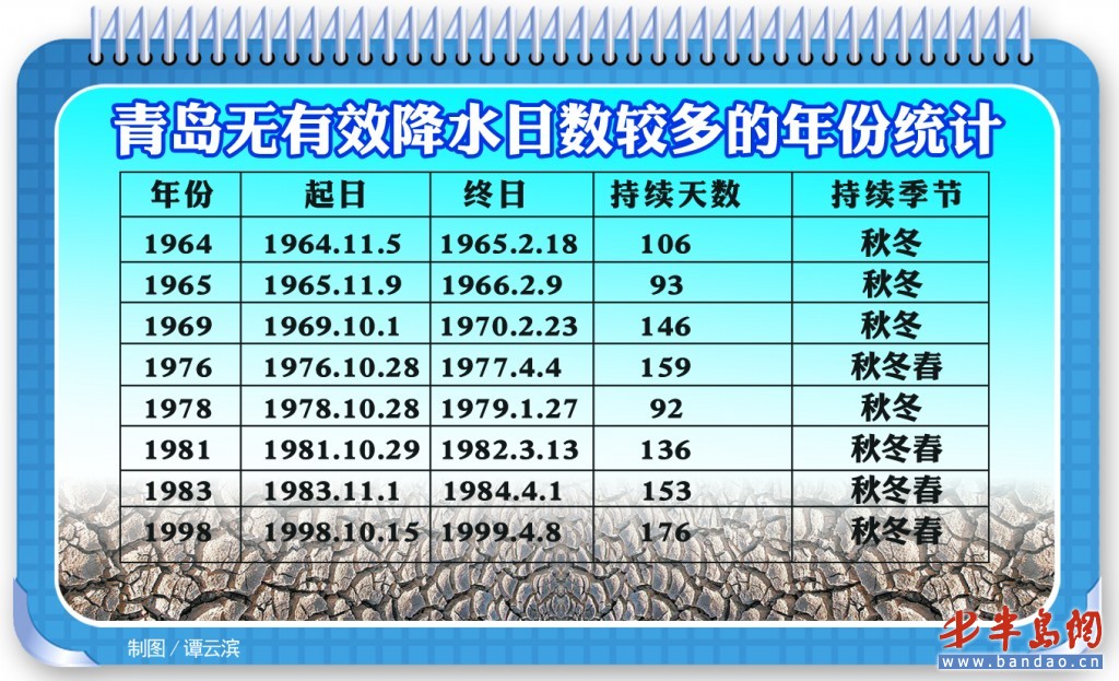 對于青島乃至山東省來說,降水的季節性很強,一年的降水主要集中在5月~9月,秋冬季節少雨,,F氣象干旱,民間有“十年九旱”的說法。據統計,本市自1961年有氣象資料記錄以來,有8個年份連續無有效降水日數超過了3個月,1976年、1981年、1983年和1998年這4個年份出現了秋冬春連旱,特別是1998年,自10月15日開始,直到1999年4月8日結束,連續176天無有效降水。