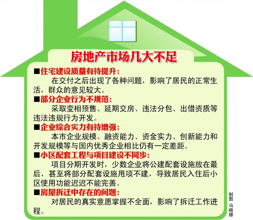 據市城鄉建設委副主任丁偉介紹,目前島城房地產業發展還存在幾方面的問題。包括住宅建設質量有待提升、部分企業不規范、企業綜合實力有待增強、配套工程與項目建設不同步以及房屋拆遷中存在的問題等!皞別項目對居民的真實意愿掌握不全面、不準確,影響了拆遷工作的推進!倍フf,《國有土地上房屋征收與補償條例》出臺后,對房屋征收工作提出了新的要求,島城將盡快研究出臺相關政策,保持本市房屋征收工作的持續順利開展。