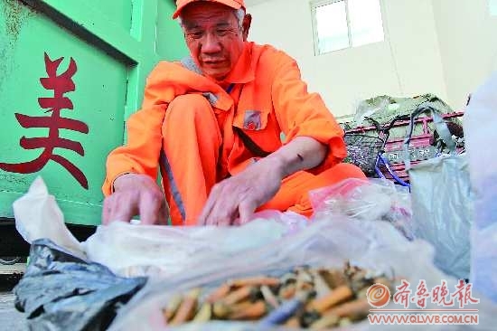 5月23日,泉城路商業(yè)街環(huán)衛(wèi)所的保潔員賈濟祥正在整理垃圾中轉(zhuǎn)站的煙頭。通訊員 賈嘉 攝