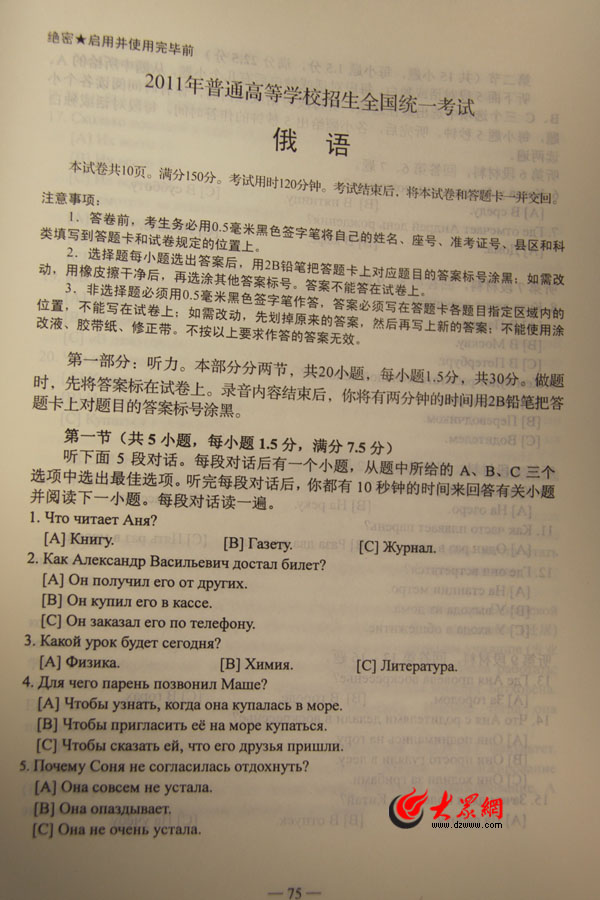 2011年山東高考俄語試題及參考答案