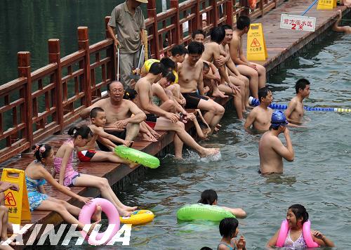 當日是農歷節氣大暑,泉城濟南最高氣溫達到35攝氏度,位于濟南市環城公園的免費泉水浴場吸引眾多市民前來游泳避暑。