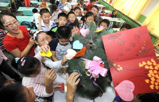 9月9日,親情洋溢在山師附小二年級(jí)7班內(nèi),激動(dòng)地呂娜老師直抹眼淚。教師節(jié)來臨,不光二年級(jí)7班的小朋友送來了賀卡,就連已經(jīng)上了六年級(jí)的的同學(xué)們也來到曾經(jīng)的班主任呂老師身邊,為老師送上-------“老師,教師節(jié)快樂!”(記者 左慶攝)
