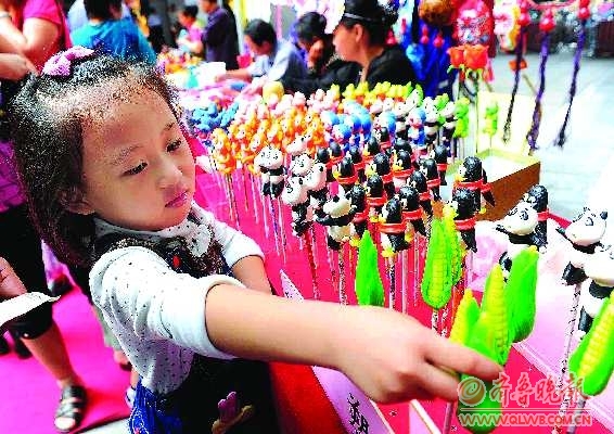 10日上午,本報(bào)“張剛大篷車”聯(lián)合濟(jì)南市民俗旅游文化產(chǎn)業(yè)協(xié)會主辦,濟(jì)南市民俗藝術(shù)館舉辦“迎中秋·民俗文化藝術(shù)節(jié)”,走進(jìn)了陽光100社區(qū)。“除了面塑、剪紙外,我們還為市民準(zhǔn)備了皮影戲等難得一見的傳統(tǒng)民俗表演。”濟(jì)南市民俗館館長劉學(xué)斌表示,讓市民感受傳統(tǒng)藝術(shù)的魅力,非常有意義。圖為一名可愛的女孩伸手觸摸面塑作品。 本報(bào)記者 邱志強(qiáng) 攝