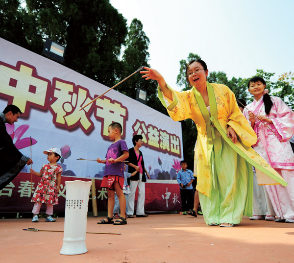 9月11日,大學(xué)生在煙臺(tái)市南山公園參加戰(zhàn)國時(shí)流行的宴飲游戲——投壺。當(dāng)日,來自魯東大學(xué)、山東工商學(xué)院和煙臺(tái)大學(xué)的漢文化愛好者身著傳統(tǒng)漢服,按照傳統(tǒng)舉行祭月、投壺和漢服展示活動(dòng),喜迎中秋佳節(jié)。
