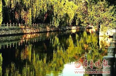 21日,護城河水分外安靜清澈,垂柳倒映在水中形成美麗的圖畫,顯示出秋季獨有的魅力。 本報記者 周青先 攝
