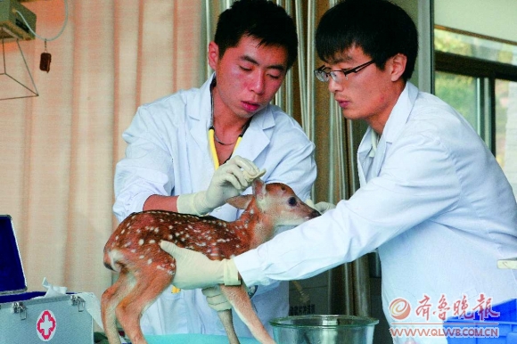 26日早6點,臺灣贈送大陸的梅花鹿“點點”在威海劉公島國家森林公園產下一只雌性小鹿。小鹿的父親為同來大陸的“繁星”。圖為飼養員在為小鹿體檢。