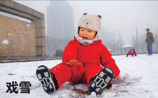 30日的降雪讓我省中東部地區的高速公路癱瘓,大批返程的旅客因此在路上多走了一兩個小時。圖為孩子在玩雪。