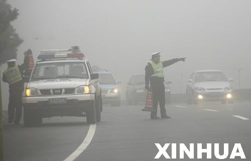 3月17日,在山東201省道威海市機場路上,該市交警五大隊民警在濃霧中設置警示標識。