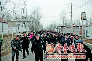 民警抬著被擊斃的咬人狼走在村路上,引來大批村民圍觀。 本報通訊員 馮青 秦存超 攝