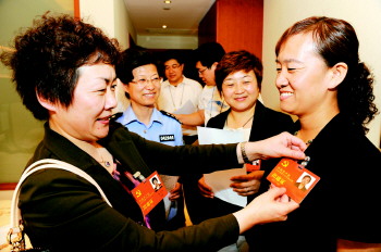 ▲5月22日,出席省第十次黨代會的煙臺代表團的代表報到后,興高采烈地將出席證佩戴在胸前!跤浾摺蛎瘛》抠t剛 報道
