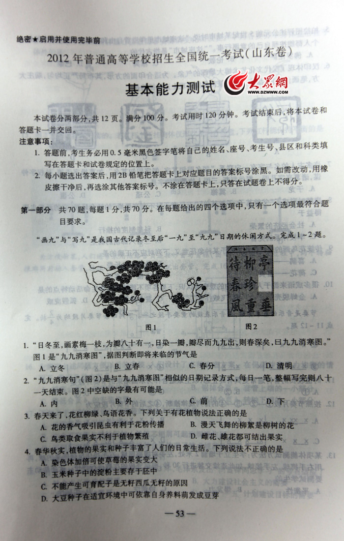 2012年山東高考基本能力測(cè)試試題及參考答案