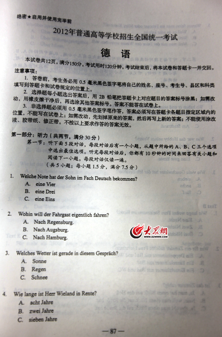 2012年山東高考德語試題及參考答案