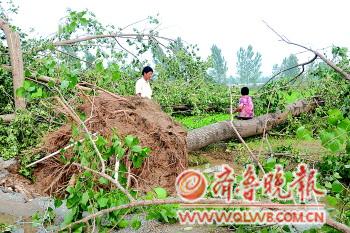 12日晚,一場龍卷風襲擊了菏澤成武縣,幾十厘米粗的大樹被連根拔起。 實習生 袁慧 攝