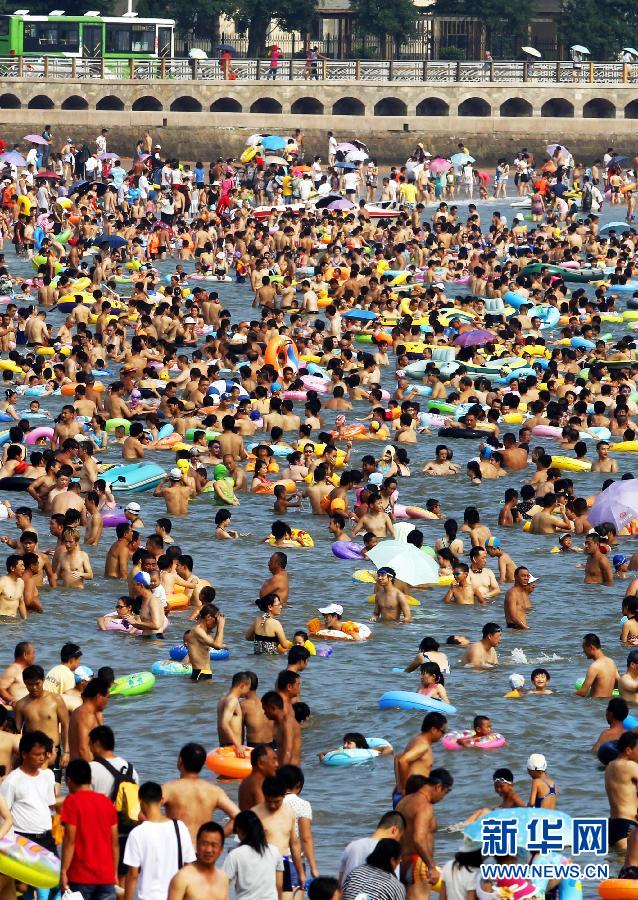 8月12日,游客在青島第一海水浴場戲水納涼。 8月份以來,避暑勝地青島全面進入旅游旺季,青島國際啤酒節的開幕更讓游客接待量達到一年中的最高峰,各景區人滿為患。去年年青島全年接待國內外游客首次突破5000萬人次,達到歷史性的5072萬人次。新華社記者李紫恒攝