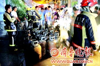 本報濟南8月16日訊 (記者 張亞楠 實習生 岳倩南) 16日晚6點多,濟南市中區后龍窩莊一煤氣商戶發生煤氣罐爆炸。暫未有人員傷亡消息,事故原因正在調查中。 16日晚6點多,轟然一聲巨響,把住在后龍窩莊一棟樓房里的曹凱嚇了一跳。沒過幾秒鐘,又是一聲炸響。“連接響了四五聲,好像樓塌了一樣。”曹凱看到爆炸地點是距離自己住處不過200米的一處房屋,爆炸引起的火焰把三層樓高的樹冠燒著了。曹凱趕向爆炸地點,看到爆炸引發了三層樓高的大火,火球躥到大樹樹冠上,樹冠頂上的葉子都燒焦了。三層樓的窗戶玻璃都震沒了,空調外掛機也燒變了形。 7點20分許,記者來到后龍窩莊爆炸地點,大火已經被撲滅。街道上淌著水,一輛救護車在爆炸點附近閃爍著燈光。街道上擠著圍觀居民,民警把人群攔阻在爆炸點外圍。20多個煤氣罐被消防人員從爆炸地點清理出來,已經不同程度地變形。居民稱發生爆炸的一家是賣煤氣的。一居民說,“他家是賣煤氣的,剛買了輛面包車,不知道是不是拉煤氣罐用。聽說是面包車不知道什么原因燒了起來,引燃了煤氣罐,發生了爆炸。”