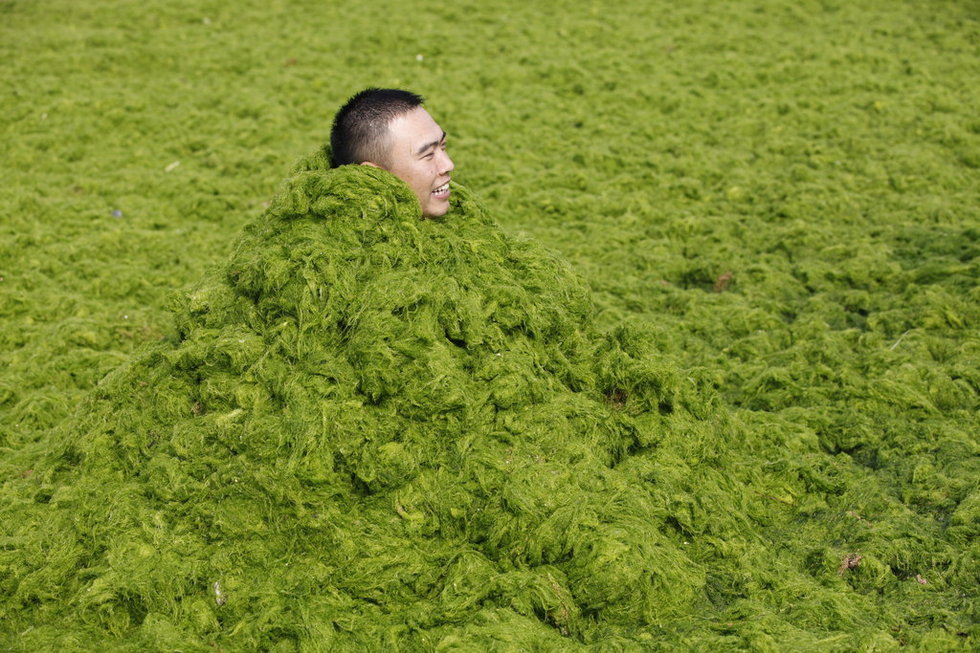 2013年7月3日,山東省青島市,受持續(xù)南風(fēng)影響,最近漂移在黃海海域的大面積滸苔綠藻登陸青島海灘,大量綠色滸苔堆積在海灘,使得青島海灘變“草原”。圖為游客用滸苔堆滿全身乘涼。攝影:小米