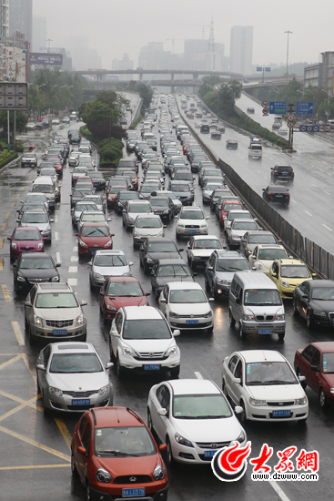 7月9日,8時許,因為降雨而擁堵的經十路。 攝影 楊春衛