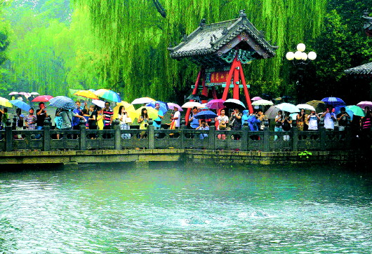 7月14日,濟南趵突泉地下水位達到28.56米,比13日上升了15厘米。而與5天前的28.11米相比,則整整上升了45厘米。由于降雨還將持續,這一水位還將持續上升。圖為游客冒雨游覽趵突泉公園。