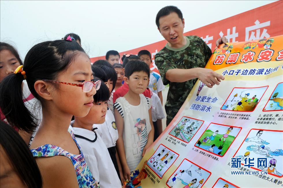 青島是一座海濱城市,選擇到海邊游泳的青少年為數不少,暑假期間是一年游泳溺亡高發期,為此,青島公安邊防支隊開展了為期一個月的暑期海邊游泳防溺水安全知識宣傳活動。通過海報展板、救護體驗、潮汐科普等方式,引導、告誡學生不到無安全設施、無救護人員、無安全保障的海邊游泳。發現他人溺水時,應立即呼喊成人施救,切不可私自下水救援,避免盲目施救,減少溺亡事故的發生。新華社記者李紫恒攝