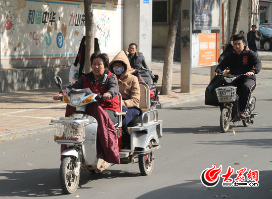 24日早,天氣降溫后很多騎車出門的市民都穿上了厚厚的棉衣。 韋輝 攝