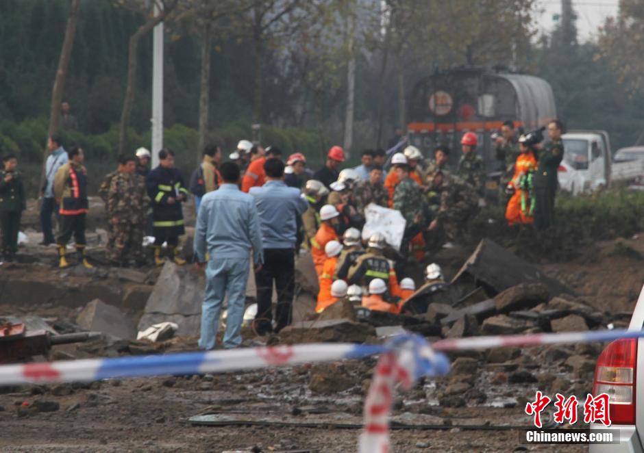 11月23日上午8點(diǎn)左右,11.22青島市經(jīng)濟(jì)技術(shù)開發(fā)區(qū)發(fā)生輸油管道爆炸點(diǎn)現(xiàn)場,搜救工作正在進(jìn)行中。據(jù)中石化黃濰輸油管線爆燃事故現(xiàn)場指揮部消息,截至目前,22日發(fā)生于青島市黃島區(qū)的中石化原油輸送管道泄漏爆燃事故已造成47人死亡。目前住院治療136人。搜救工作仍在進(jìn)行中。中新社發(fā) 趙玥博 攝