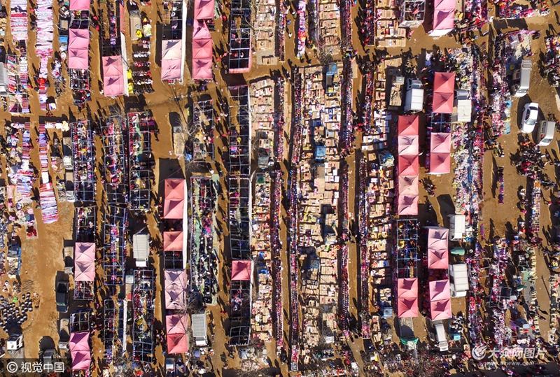 2017年1月15日,航拍器拍攝的山東省日照市東港區南湖鎮年貨大集。隨著農歷雞年春節的臨近,人們開始忙著選購山珍海味、水果、煙酒等年貨,迎接新春佳節的到來。
