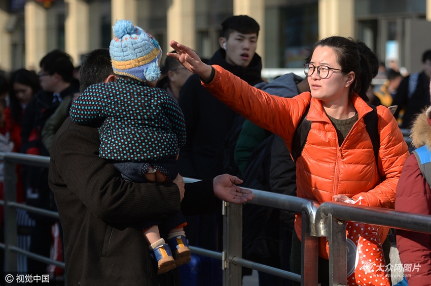 2017年02月12日,濟南火車站進站口,不少情侶擁抱惜別,也有年邁的父母含著眼淚送別外出打工的孩子,還有進城過年的老人返回故鄉老家時,與兒女親情難以割舍。