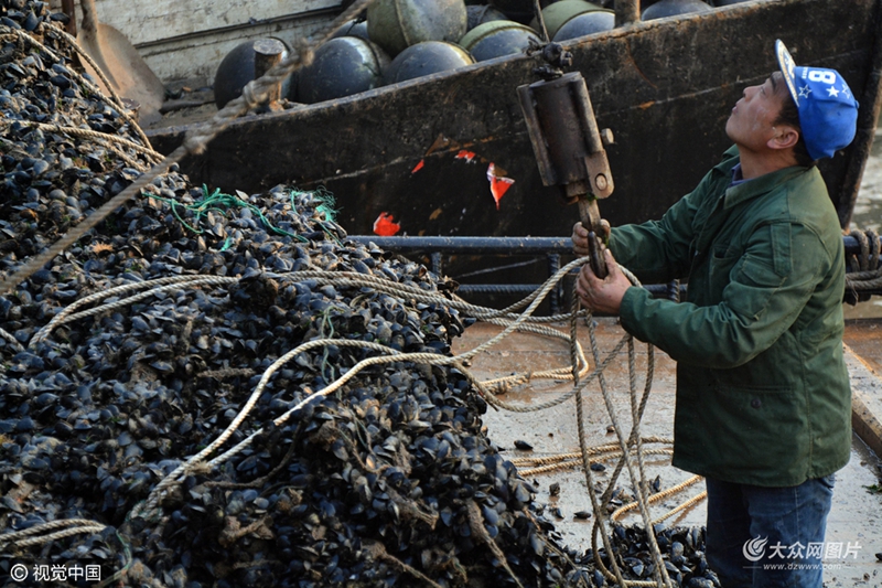 2017年2月16日,山東省日照市嵐山漁港,漁民們正在收獲海虹。人們俗稱的海虹,學名貽貝,屬軟體動物門、雙殼綱、翼形亞綱異柱目、貽貝科、貽貝屬。主要分布于黃、渤海沿岸。在山東省日照市沿海,海虹也被當地人們稱為“黑鮑魚”。