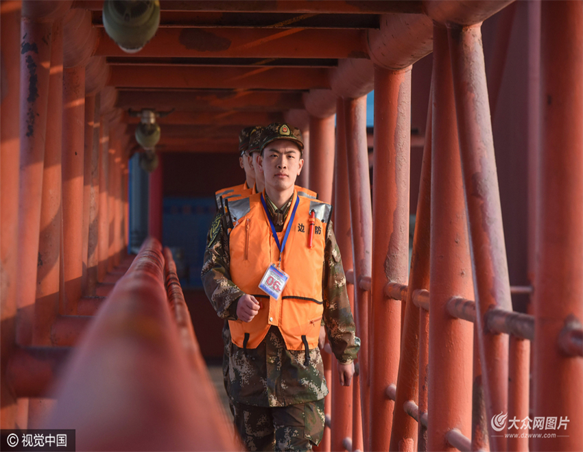 2017年2月28日,全國“兩會”前夕,山東省東營市公安邊防支隊船艇大隊在中石化勝利油田海上主產區開展專項巡航,邊防官兵登上采油平臺檢查安全設施和警戒設備,確保海上生產作業環境安全有序。