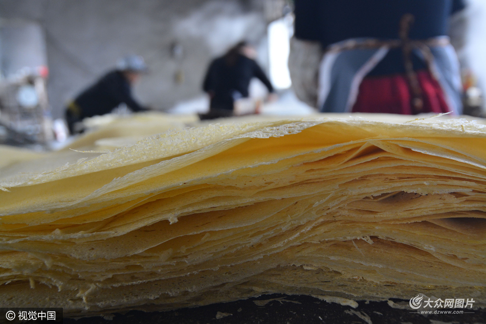 3月1日,在山東省日照市莒縣龍山鎮北上澗村,一家煎餅作坊里,已經烙好的煎餅薄如紙片。