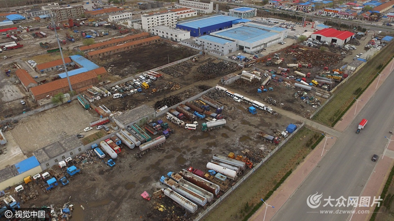 2017年4月9日,在山東東營市西四路上,航拍東營最大報廢汽車回收處,如同小朋友玩積木一樣,將廢舊契合分類。工人將汽車堆積在一起,將貨車、公交車、油罐車、以及汽車輪胎、車座椅、發(fā)動機等拆卸肢解后進行分類,俯瞰場面十分震撼。