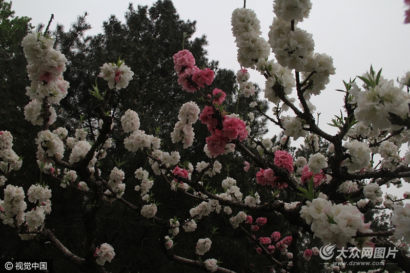 2017年4月10日,在山東濟南百花公園景區(qū)內(nèi),近百株榆葉梅競相綻放,招引眾多市民游客前來踏青遨游花海,令人流連忘返的美景吸引不少路人拍照留念。
