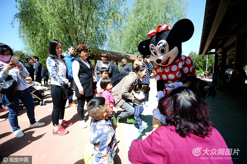 在濟南森林公園的草坪上,一只"米老鼠"吸引了不少游玩的市民爭相合影,每次合影的費用從1元到5元不等。卸去木偶服后,竟是一位頭70歲的老奶奶。