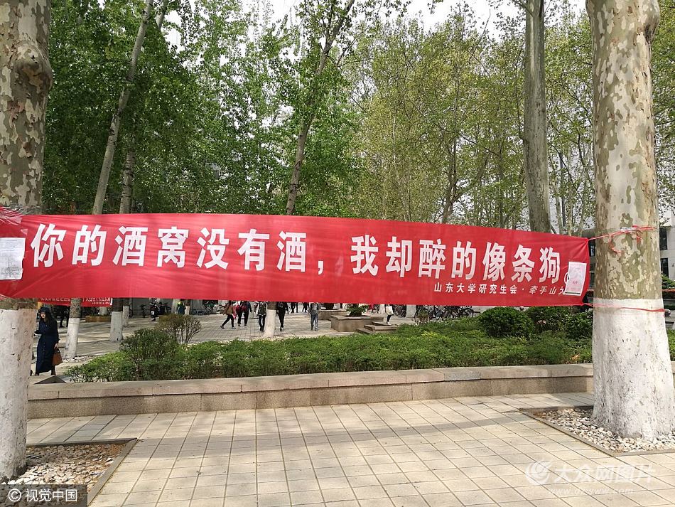 2017年4月24日,濟南,山東大學,記者用鏡頭記錄下搶眼的趣味條幅。