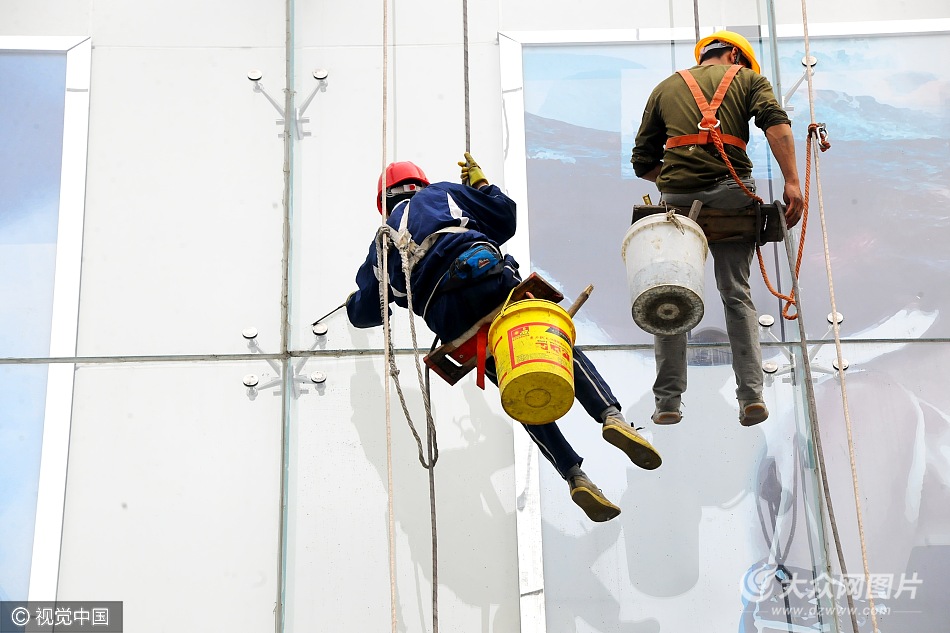 布滿泥點的褲子,滿是灰垢的橡膠手套,手上磨著一層厚厚的繭。牢牢綁緊兩道繩索,坐在簡單的特制吊板上,輕輕一躍就從50多米高的樓上順繩而下,五一勞動節假期的街道上,往來人流匆匆、車輛如織,卻未曾有一個人注意過仍在悶人氣溫下辛苦勞動的高空作業者們。