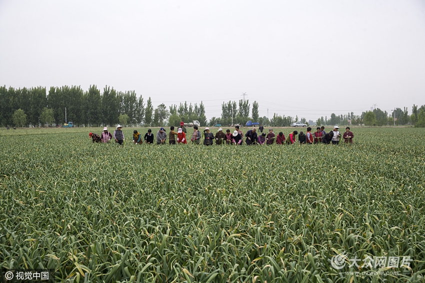 2017年5月8日,山東省禹城市梁家鎮,農民們在采收蒜薹。