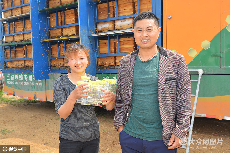 2017年5月10日,山東日照,今年40歲的郭龍和39歲的妻子陳根英,是江西省高安市人。從清明節前,夫妻倆開著養蜂專用車,從老家江西一路放蜂采蜜,開到山東日照,一個半月的時間收入八九萬元。