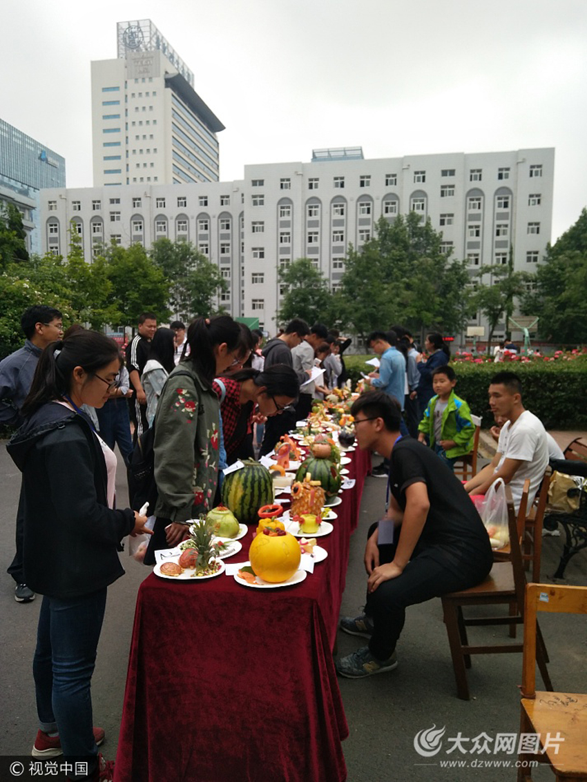 5月21日,山東青島市,青島一高校舉辦水果雕刻比賽,吸引了眾多大學生參加。香瓜、西瓜、菠蘿、茄子等各類蔬菜瓜果被雕刻拼成各種創意作品,網友紛紛稱萌萌噠。