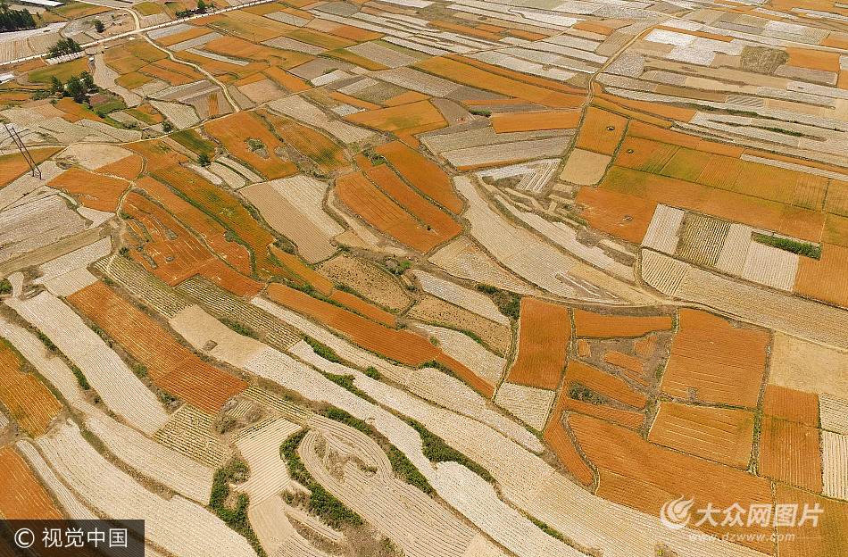 “上帝”視角下的金色麥田,不規則的排列在大地之上,阡陌之間,一排排,一列列,在覆蓋塑料地膜的花生田的映襯下,形成了一個個抽象的幾何圖形,十分壯觀。