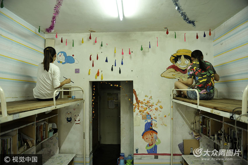 7月6日,在聊城大學宿舍內,美術學院組織學生開展裝扮宿舍 文明離校活動,畢業生結合自己的專業優勢,用油畫、貼紙、卡通涂鴉等方式對宿舍進行裝扮,讓宿舍煥然一新,迎接新同學的到來。