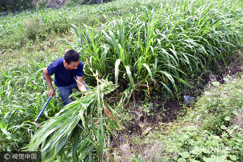 陳龍明在收割青草,準備喂食螞蚱。