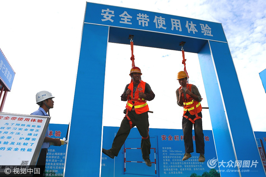 中建八局一汽華東生產基地的建筑工人在即墨市建筑安全教育體驗基地參與安全帶使用項目體驗。