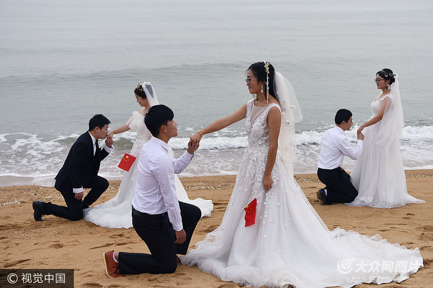9月29日,日照市萬平口風景區,12對新人在大海邊的沙灘上寫下祝福、發下誓言,開始了浪漫的“海誓山盟”之旅,拉開了2017日照市第十五屆青年集體婚禮的序幕。