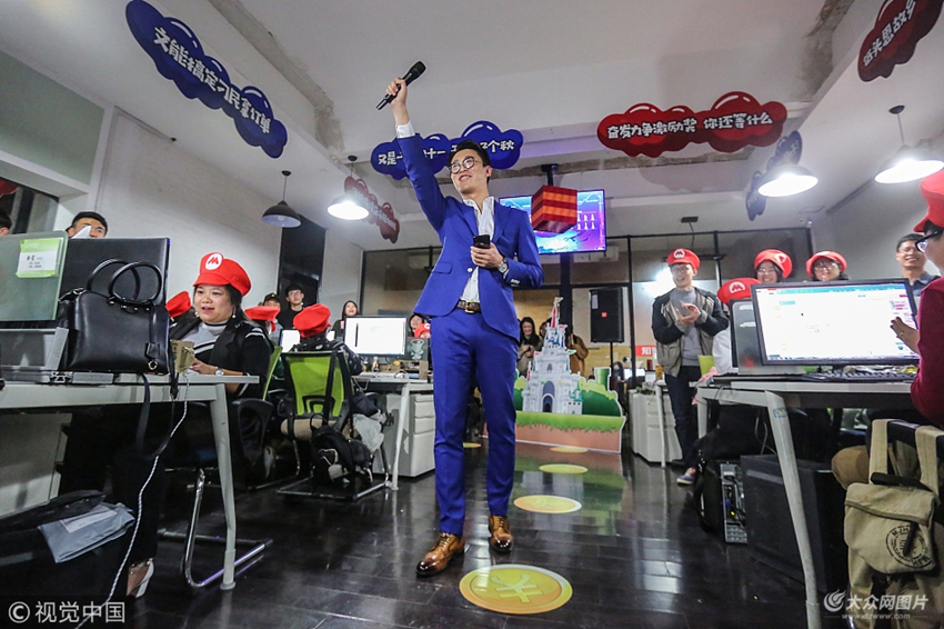 2017年11月10日晚,青島,今年“雙十一”他們將辦公室裝扮成“超級瑪麗”。