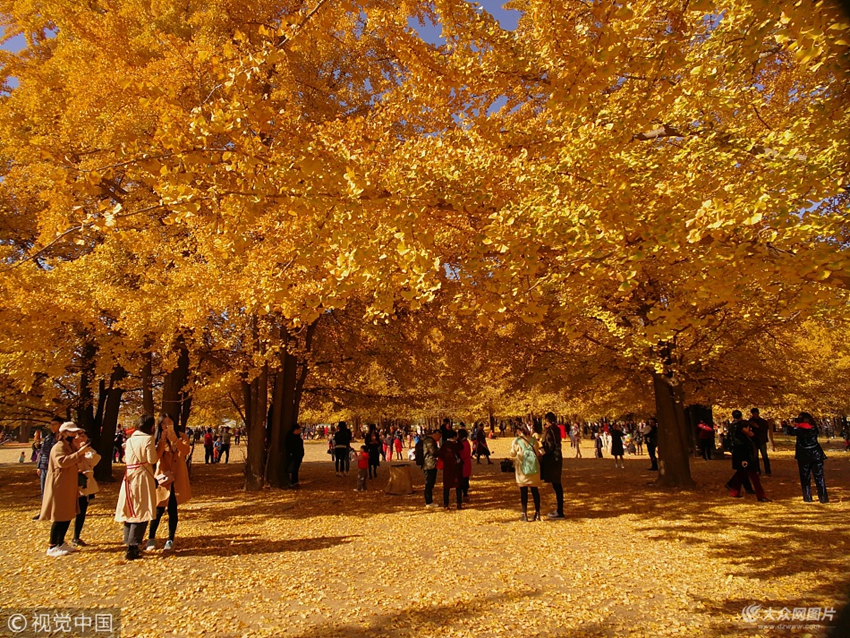 2017年11月11日,山東臨沂,生生園一片金黃,吸引眾多市民和攝影師愛好者前來參觀游玩。