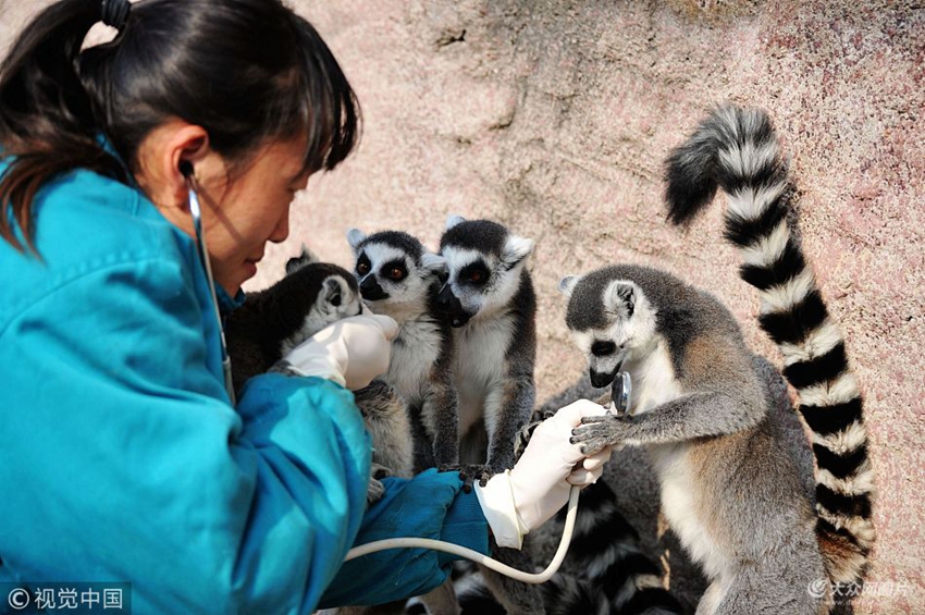 2017年11月21日,山東青島森林野生動(dòng)物世界,動(dòng)物醫(yī)生在對(duì)環(huán)尾狐猴進(jìn)行聽(tīng)診檢查。