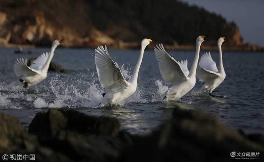 2017年12月2日,在山東省榮成市煙墩角港灣,幾只大天鵝在水面追逐嬉戲。