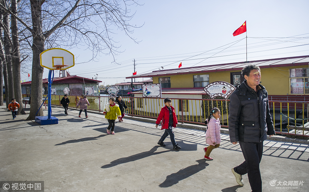 大眾網12月10日訊 山東省微山縣的高樓鄉,微山湖的西南角有一所水上小學。學校的學生都是附近漁民家的孩子,平時跟家人住在船山,上學的時候都是坐船去學校。這所小學只有5名老師,有學前班和一年級二年級,現在在校的學生一共只有三十四個人。到了三年級,孩子們就得到十幾里水路以外,去念寄宿制的中心小學。學校雖然不大,但教學的成績在高樓鄉的所有小學當中卻總能名列前茅。圖片作者:洪曉東/視覺中國