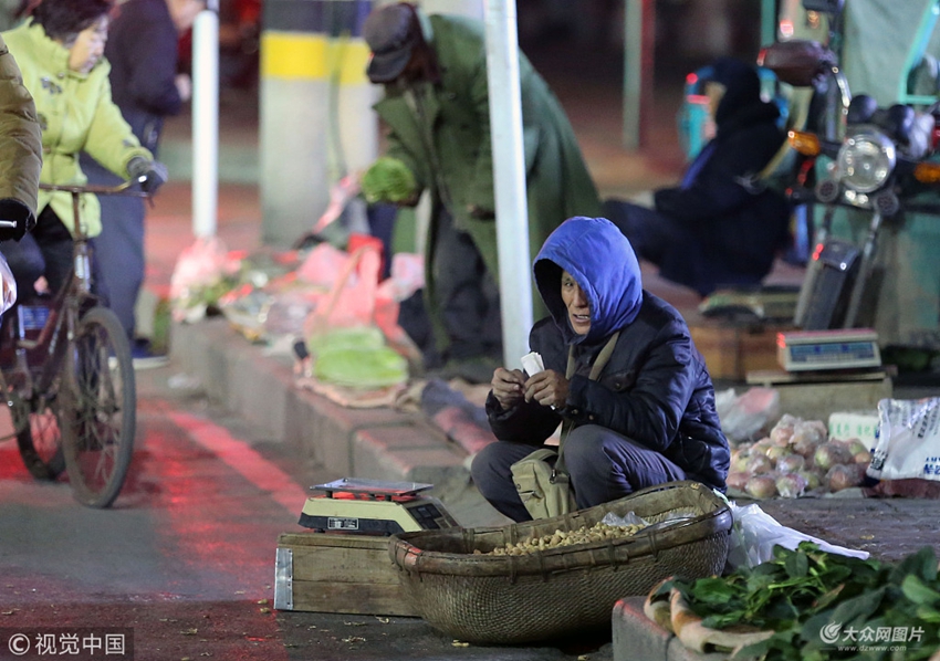 2017年12月14日,山東省濰坊市,早市的商販們正在馬路一側(cè)忙碌的經(jīng)營著自家產(chǎn)品。